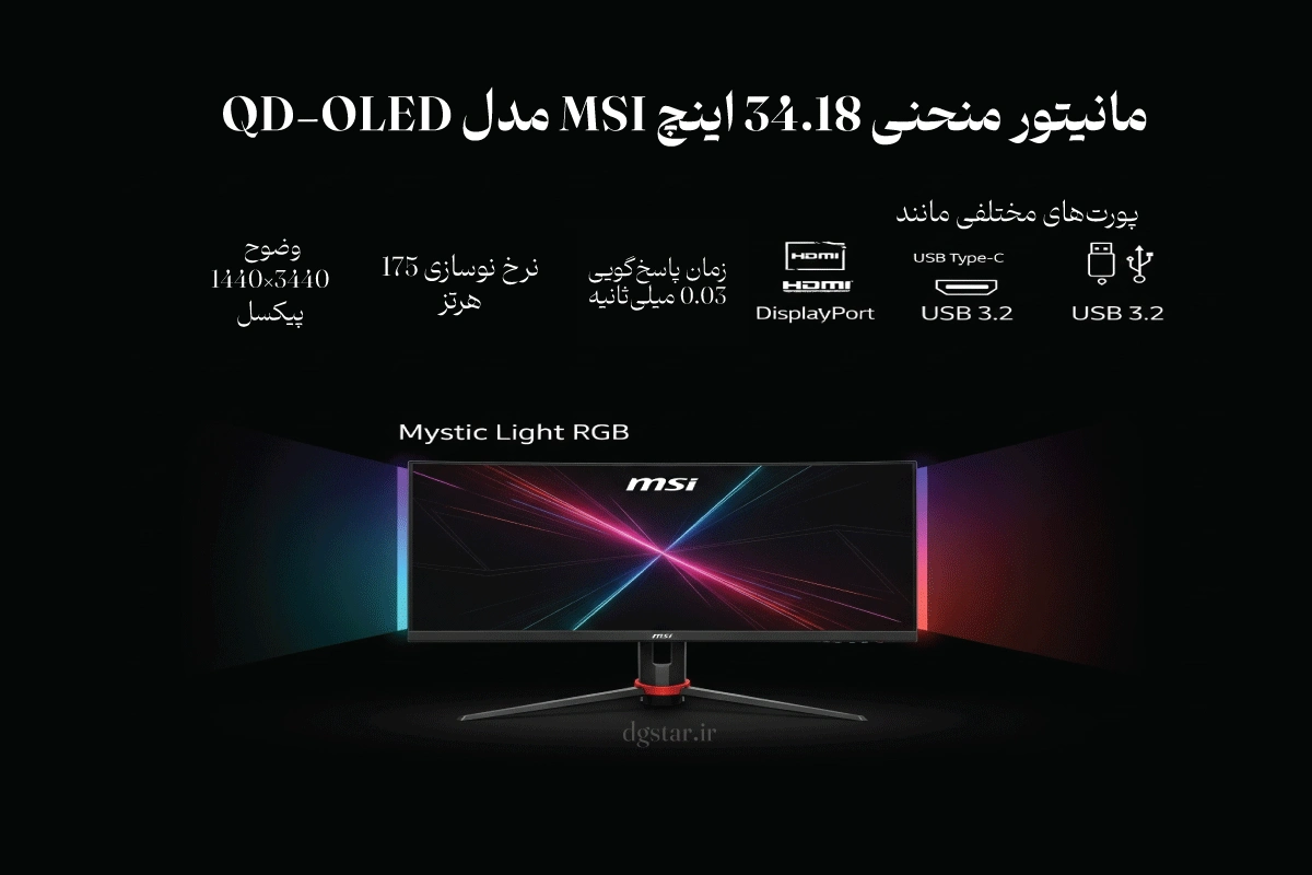 در نهایت نیز باید به این موضوع اشاره کرد که این صفحه نمایش با داشتن سیستم نورپردازی Mystic Light RGB امکان تنظیم جلوههای نوری مختلف را فراهم میکند و محیط کاری جذابتری میسازد. همچنین، وجود پورتهای مختلفی مانند USB Type-C، HDMI، DisplayPort و چندین درگاه USB 3.2، اتصال آسان به انواع دستگاهها را ممکن میسازد.